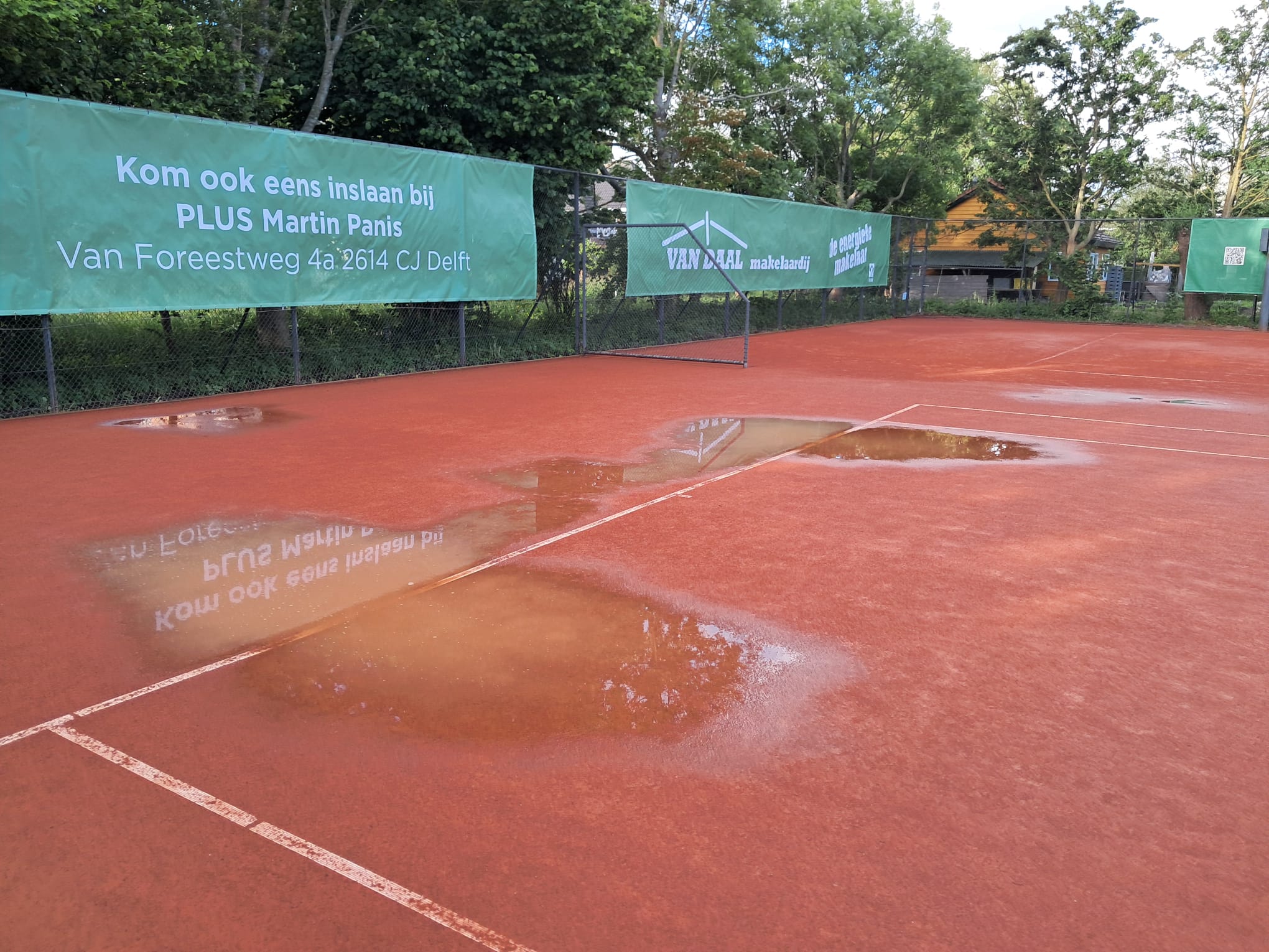 De baan is bespeelbaar als er geen plassen liggen en de baan niet meer glimt. Zo houden we de 30 jaar oude banen goed met elkaar.
