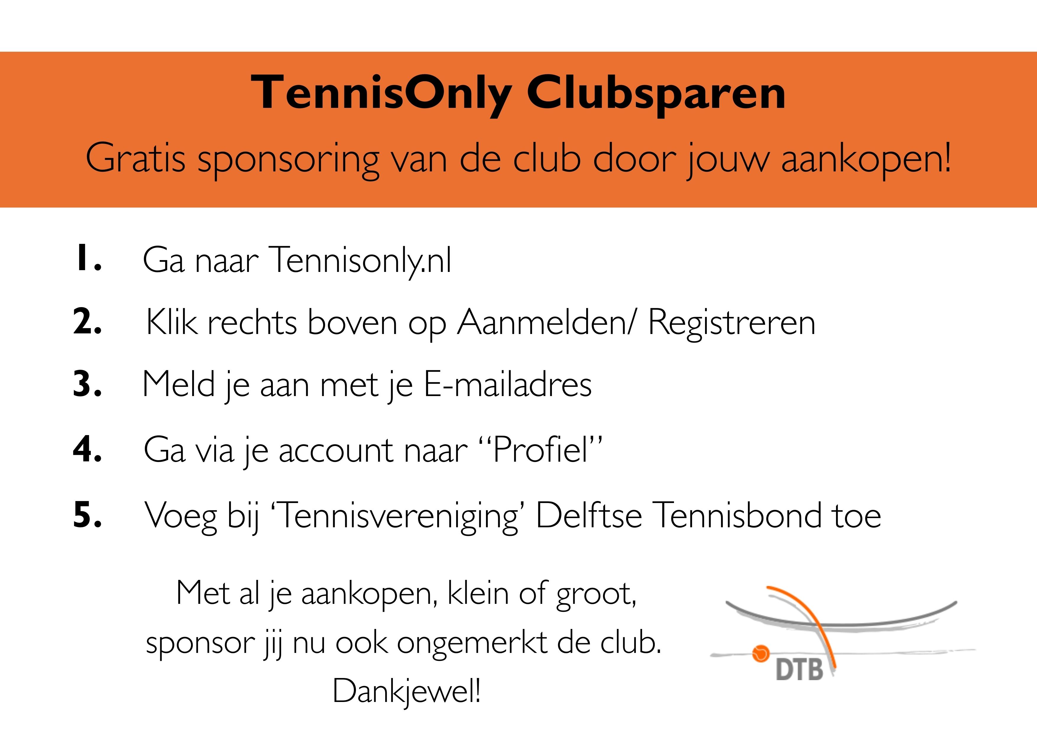 Registreer onze tennisvereniging bij TennisOnly en steun de club automatisch bij elke aankoop die je daar doet (zie afbeelding). Zo draag je zonder extra kosten bij aan een sterk en sportief seizoen voor iedereen.