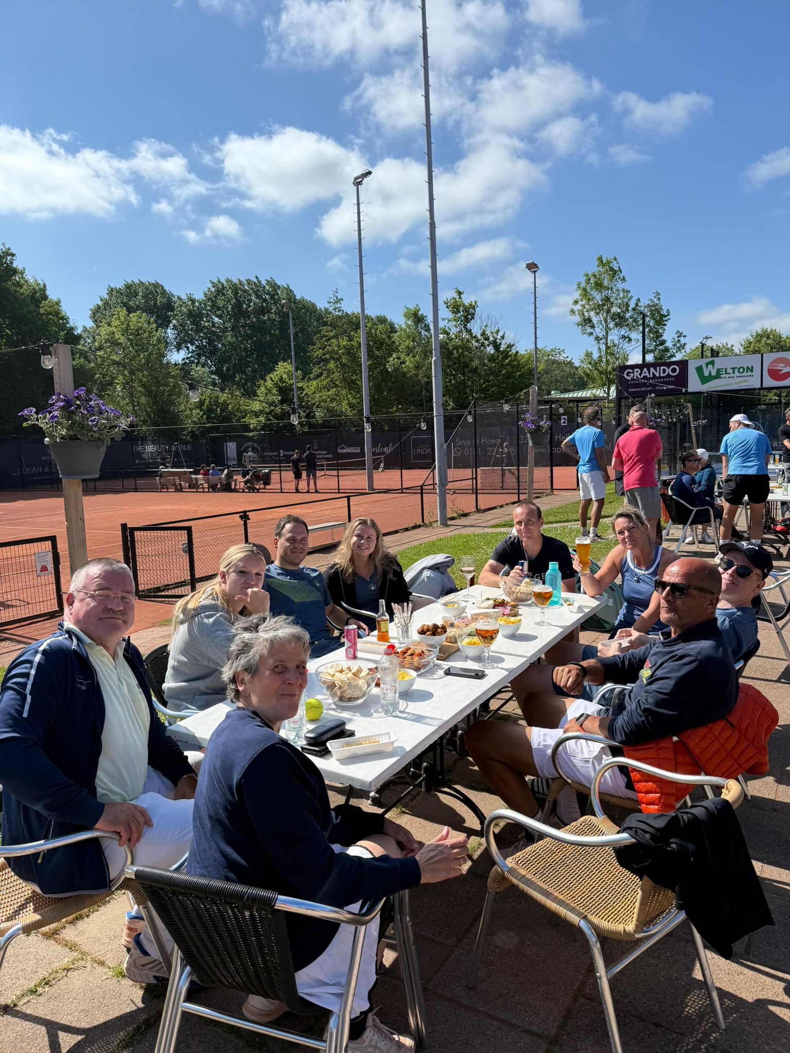 Op het terras praatten we nog lang genoeglijk na, geholpen door frisse biertjes, loempiaatjes van de markt en een enorme, door de tegenstanders zelf rijk gevulde borrelplank met voor elk wat wils. Einduitslag 2-3, een super sportieve en gezellige dag. Moe maar voldaan zette Peter de teamgenoten weer af in de haven en keerde terug naar DTB om nog in de avondzon te genieten van enkele spannende dubbels.