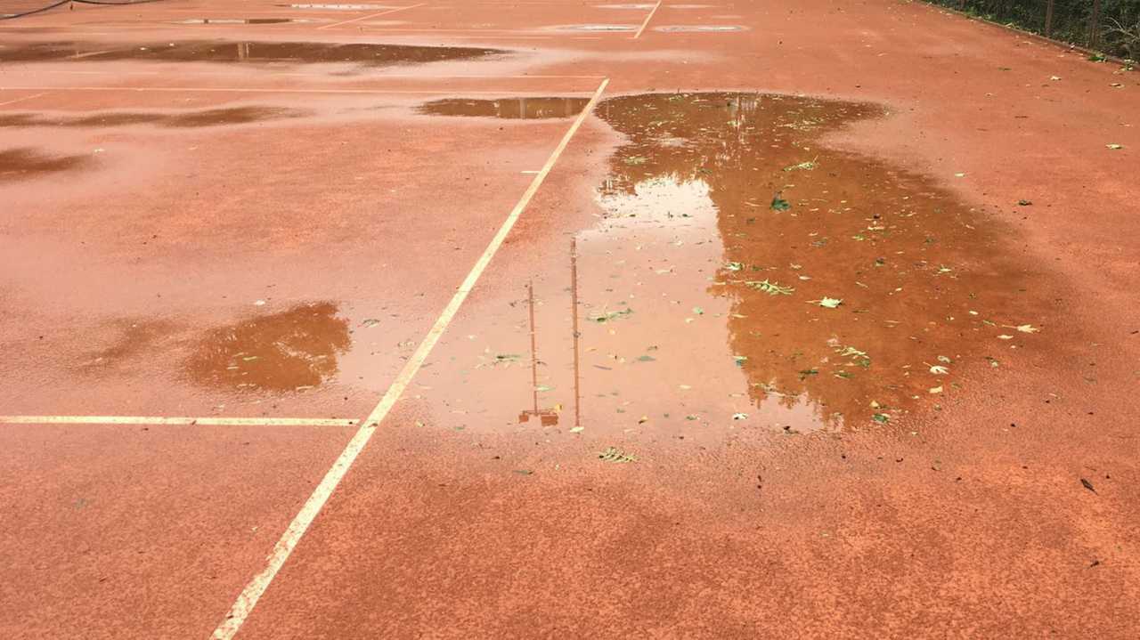Een klein lichtpuntje: we hebben er een toeschouwer bij. Amy noemen we haar. Geen speler, maar een storm die ons zondag stevig in de gaten hield. Tennissen in windkracht tien en miezerregen? We waren er bijna voor in de stemming.